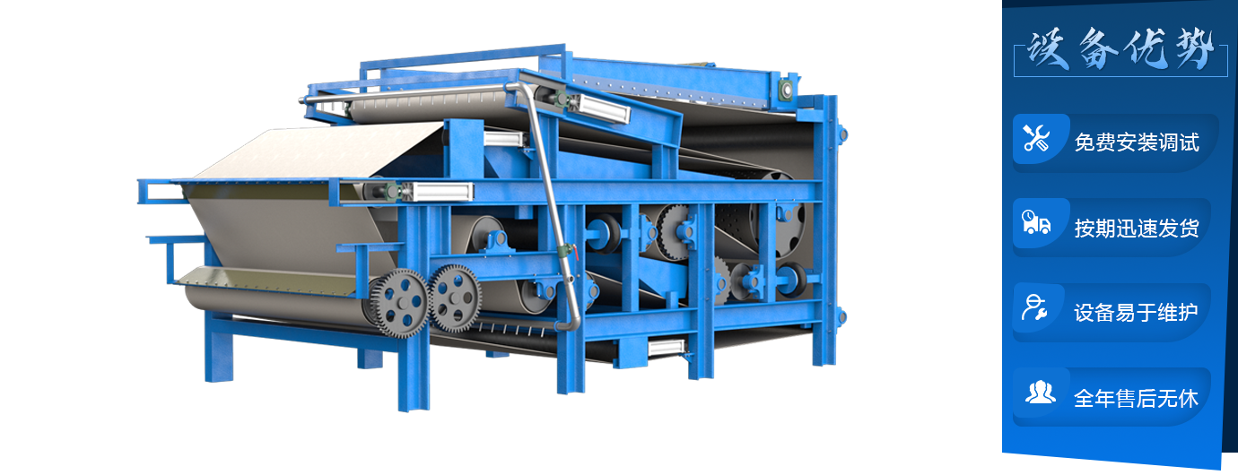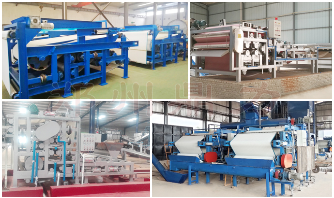 物料經(jīng)過輸送機,輸送到脫水機的料斗中,經(jīng)過螺旋布料器均勻地鋪在濾帶上,濾帶隨著設(shè)備的運行,限料板把料層高度刮平,使料的厚度完全均勻一致;然后上下兩條完全漲緊的環(huán)狀濾帶夾住料層,在驅(qū)動輥帶動下,脫水區(qū)內(nèi)的對輥連續(xù)多次機械擠壓,將大量的水份壓出。根據(jù)物料的特點自動調(diào)節(jié)擠壓力,滿足客戶對物料水分要求。