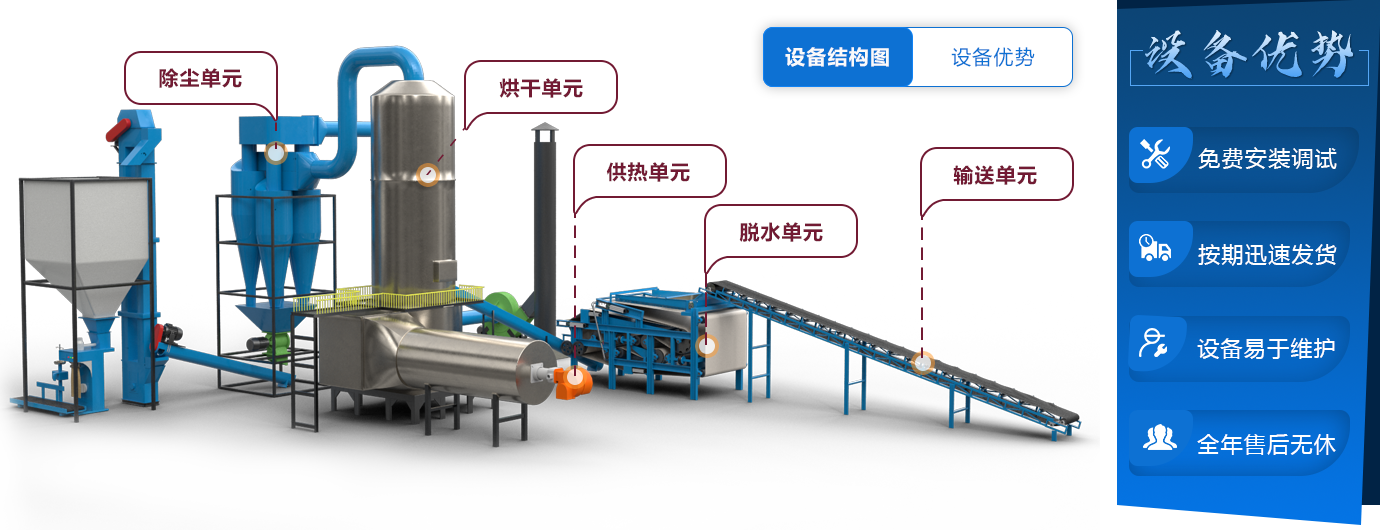 旋流閃蒸干燥機(jī)由干燥主機(jī)、加料器、熱源裝置(熱風(fēng)爐或蒸汽)、空氣過(guò)濾器、鼓風(fēng)機(jī)、旋風(fēng)分離器、布袋除塵器、引風(fēng)機(jī)等關(guān)鍵部件組成。熱空氣切線進(jìn)入干燥器底部,在攪拌器帶動(dòng)下形成強(qiáng)有力的旋轉(zhuǎn)風(fēng)場(chǎng)。膏狀物料由螺旋加料器進(jìn)入干燥器內(nèi),在高速旋轉(zhuǎn)攪拌槳的強(qiáng)烈作用下,物料受撞擊、磨擦及剪切力的作用下得到分散,塊狀物料迅速粉碎,與熱空氣充分接觸、受熱、干燥。脫水后的干物料隨熱氣流上升,分級(jí)環(huán)將大顆粒截留,小顆粒從環(huán)中心排出干燥器外,由旋風(fēng)分離器和除塵器回收,未干透或大塊物料受離心力作用甩向器壁,重新落到底部被粉碎干燥。