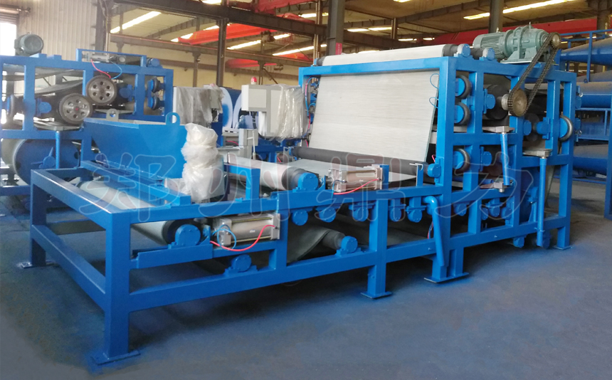 物料經(jīng)過輸送機(jī),輸送到脫水機(jī)的料斗中,經(jīng)過螺旋布料器均勻地鋪在濾帶上,濾帶隨著設(shè)備的運(yùn)行,限料板把料層高度刮平,使料的厚度完全均勻一致;然后上下兩條完全漲緊的環(huán)狀濾帶夾住料層,在驅(qū)動輥帶動下,脫水區(qū)內(nèi)的對輥連續(xù)多次機(jī)械擠壓,將大量的水份壓出。根據(jù)物料的特點(diǎn)自動調(diào)節(jié)擠壓力,滿足客戶對物料水分要求。