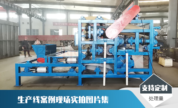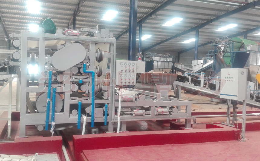 物料經(jīng)過輸送機,輸送到脫水機的料斗中,經(jīng)過螺旋布料器均勻地鋪在濾帶上,濾帶隨著設(shè)備的運行,限料板把料層高度刮平,使料的厚度完全均勻一致;然后上下兩條完全漲緊的環(huán)狀濾帶夾住料層,在驅(qū)動輥帶動下,脫水區(qū)內(nèi)的對輥連續(xù)多次機械擠壓,將大量的水份壓出。根據(jù)物料的特點自動調(diào)節(jié)擠壓力,滿足客戶對物料水分要求。