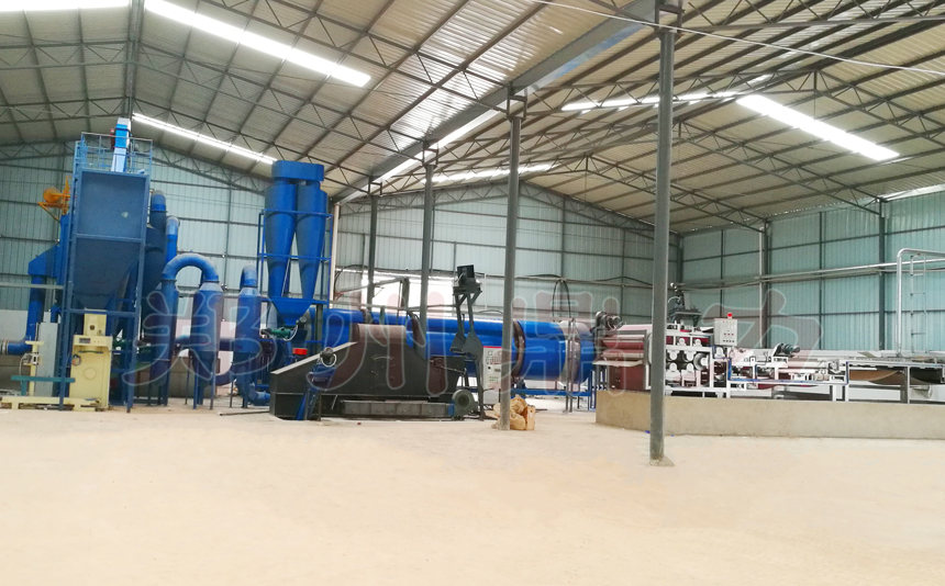 經(jīng)過預(yù)先脫水的紅薯渣有喂料系統(tǒng)進入滾筒烘干機,在持續(xù)打散和震打清理的烘干系統(tǒng)中以兩退一進的方式行進,揚料均勻,受熱均勻,該種烘干結(jié)構(gòu)有效解決了薯渣等相似物料烘干存在的糊料和黏壁問題,持續(xù)受熱強力蒸發(fā)達到干料含水35%以下進入的排出滾筒烘干機,粉碎后進入氣流烘干環(huán)節(jié),10-15秒內(nèi)完成快速干燥,達到預(yù)定含水標(biāo)準(zhǔn),進入灌裝系統(tǒng),進行打包。而氣流進入除塵凈化系統(tǒng),達到環(huán)評要求后排出,至此完成薯渣好烘干全過程。