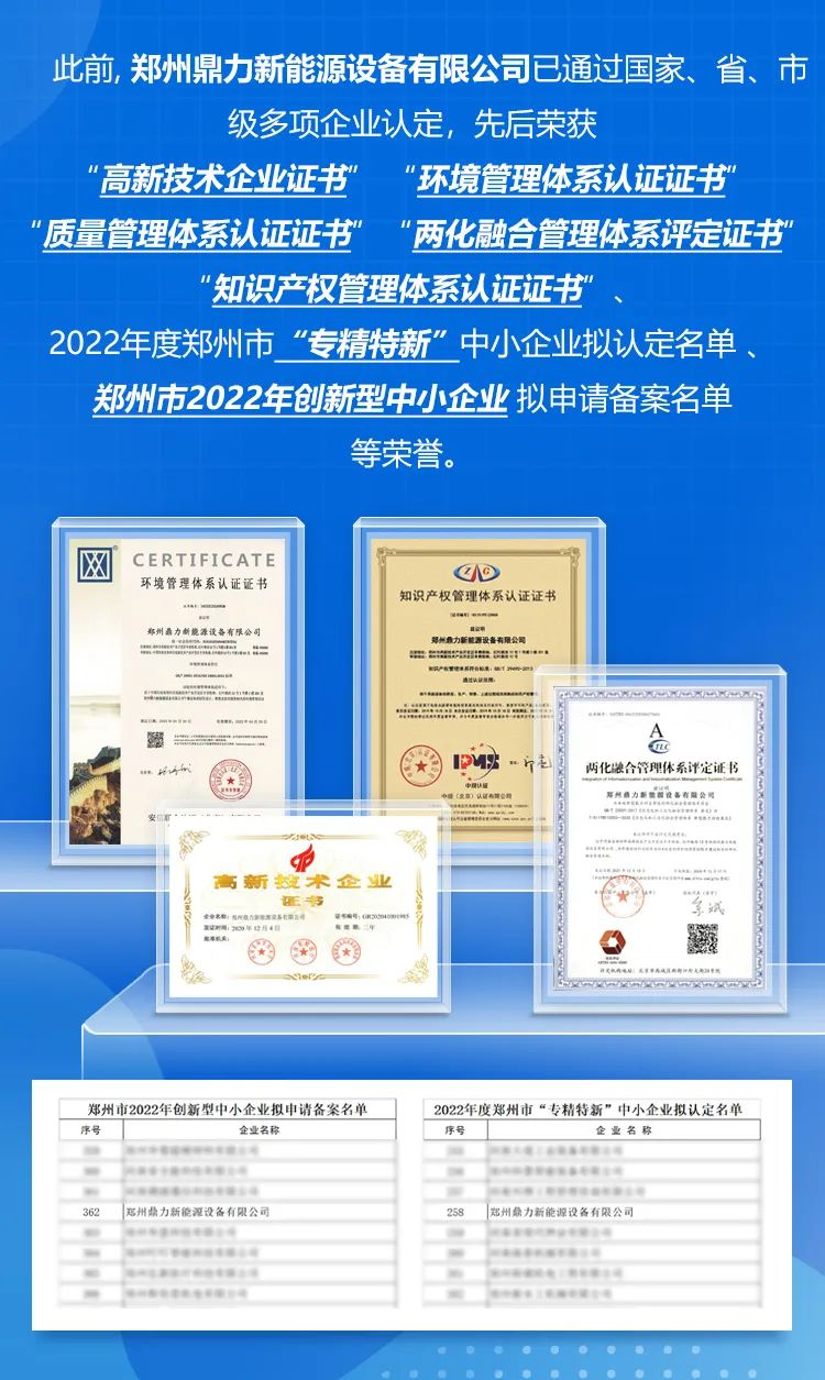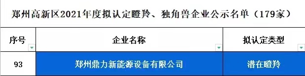 時至一年,在2023年2月10日,鄭州高新技術(shù)產(chǎn)業(yè)開發(fā)區(qū)管理委員會發(fā)布了《鄭州高新區(qū)關(guān)于公示2022年度擬認定瞪羚、獨角獸企業(yè)名單的通知》,鄭州鼎力新能源設(shè)備有限公司憑借在新能源設(shè)備行業(yè)領(lǐng)域突出的科技創(chuàng)新能力與技術(shù)優(yōu)勢,成功入選“2022年度鄭州高新區(qū)瞪羚企業(yè)名單”。